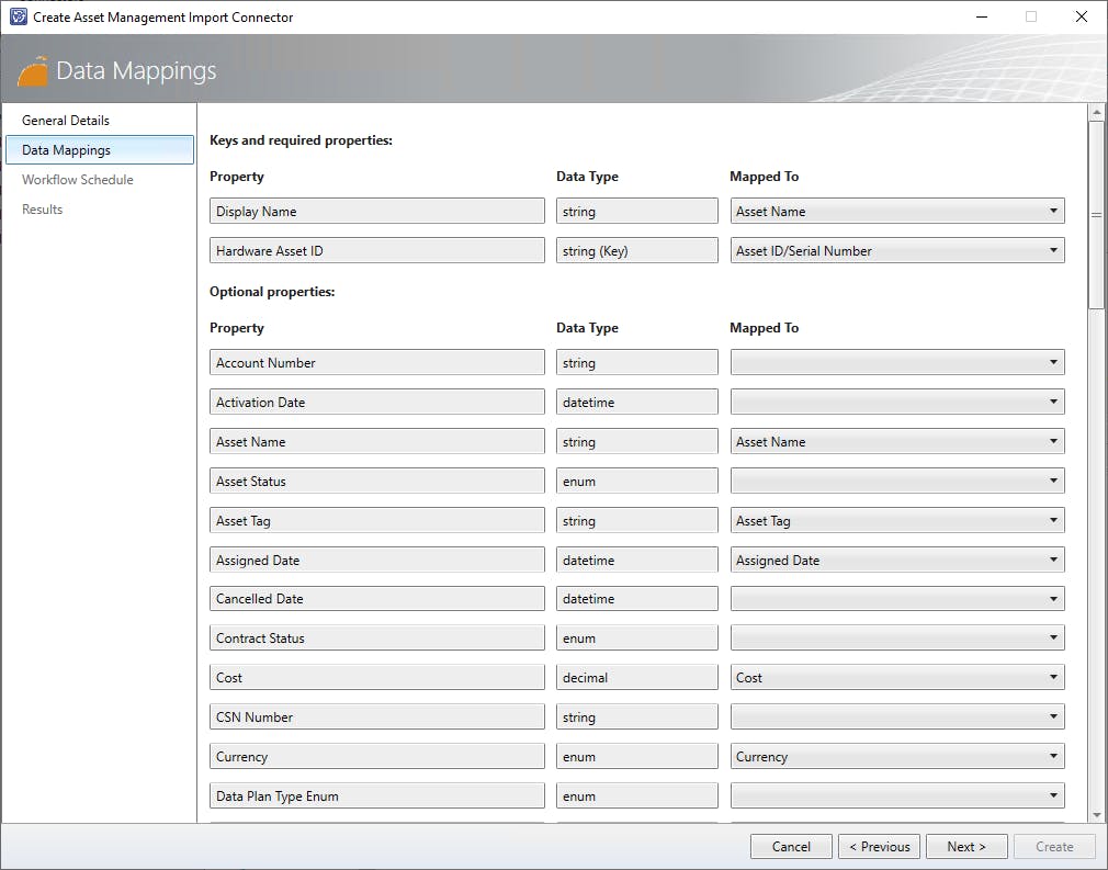 The data type is for reference of the input data type the property will expect. All keys and required properties, including Display Name, must be mapped. Whilst Display Name is not a key or required property as such, not setting it can cause issues, therefore the Asset Import app requires it to be set also. Typically this can be mapped to the same column as "Name" or a similar "naming" property.