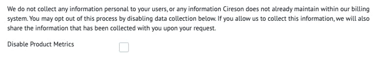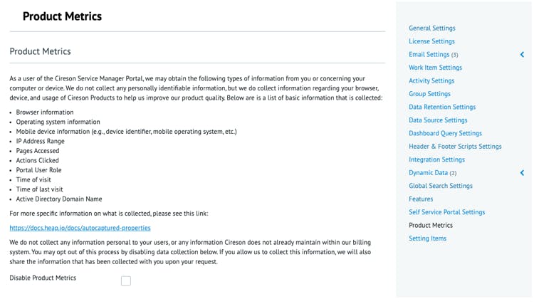Should a customer’s administration team determine that they do not want to share this information with Cireson, they can easily opt-out of metrics collection by either unchecking the box during installation, or at any time after installation in the Product Metrics administrative settings.
