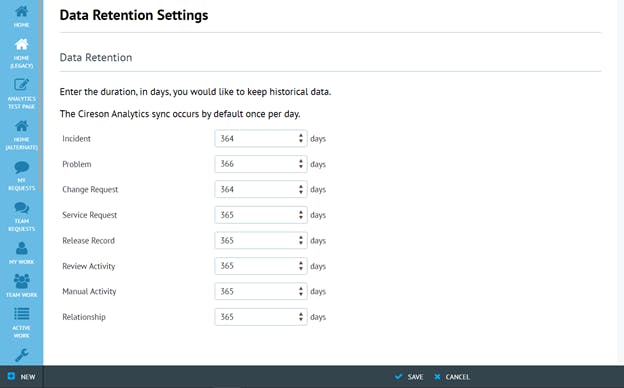 - Users can modify the work item data retention value on Admin Settings -> Analytics Settings. To Modify, simply change the values on the numeric picker and click on save to save the changes.