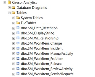 The installer will create the Cireson Analytic database (CiresonAnalytics, unless changed during the installation) and the work item table, as shown below: