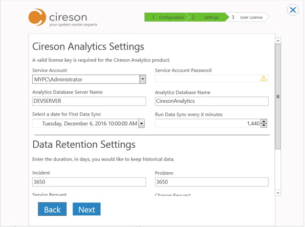 Once Install Cireson Analytics is selected, Cireson Analytics Settings will be added as a page during the installation process. Here, users can complete the following: