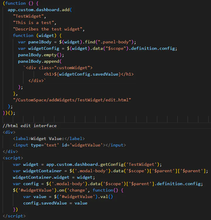 - Define the Edit interface in an html file in CustomSpace [optional]. In order for the widget to have a configuration screen similar to the existing dashboard widgets, you will need to create an html file and pass the path in as the Edit interface parameter.