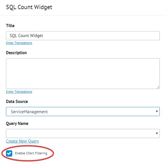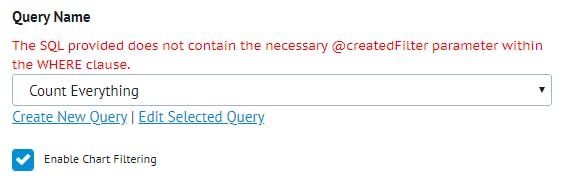 Check the option to start filtering on your widget contents. Notice on the image below that an error was raised upon enabling chart filtering. To correct this, you need to add the @createdFilter paramater as part of your query: