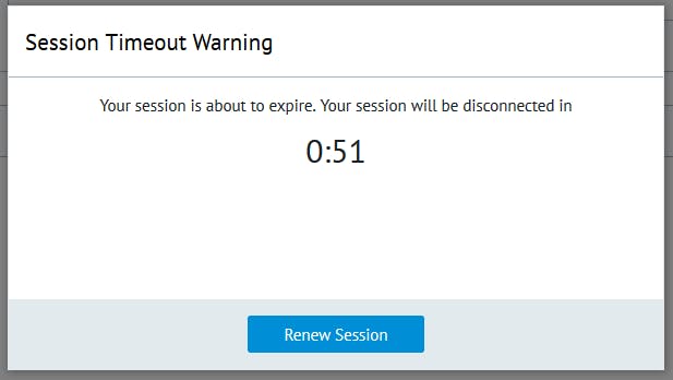 The Session Timer feature provides the user with a countdown window when their session is about to expire and gives them an opportunity to Renew Session to continue working before the session expires.
