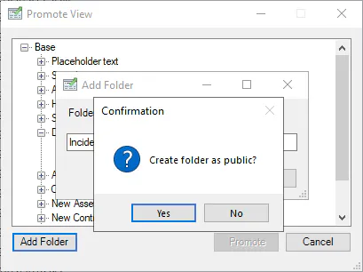 Public Views/Folders are views or folders that are Promoted/Created and visible to everyone. (Further access controls can be applied and managed from the Portal Navigation Settings. If you want your Promoted View to be public, simply click Yes to Create the folder/view as public or No to create your folder as private.