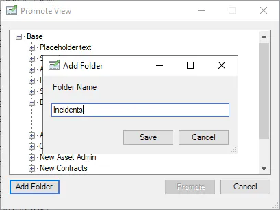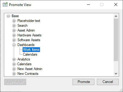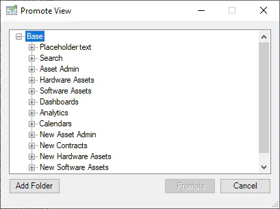 A View can only be promoted to a leaf folder, once a leaf folder is selected, click the Promote button to promote the View to the current navigation location.