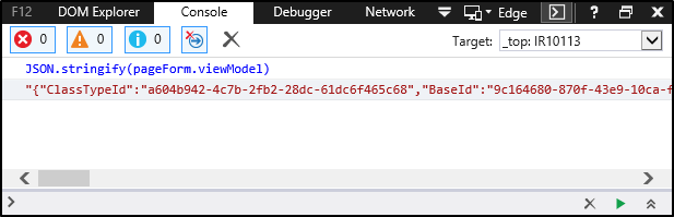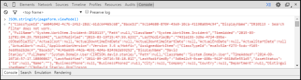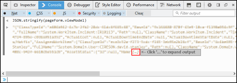 Paste or type in your command on the input line then press 'Enter' to execute the command. In this example we are getting the raw data of a work item by using JSON.stringify(pageForm.viewModel). You will see an output similar to this: