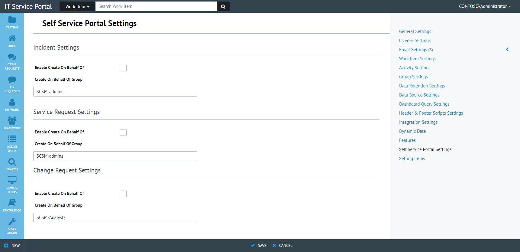 Important Note: The CreateOnBehalfOfGroup settings and equivalent Work Item settings in the Setting Items page will display these settings, but have now been depreciated and will not allow for modifying these groups. Versions older than 9.4 will still be able to use these settings.