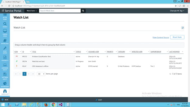 Analysts may edit the user watch list for the following work items: Incident, Service Request, Change Requests, Problem, Release Record