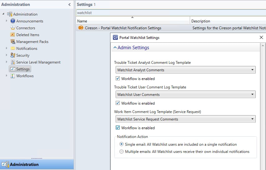 Then in Administration -> Settings double click "Cireson - Portal Watchlist Notification Settings" to configure.