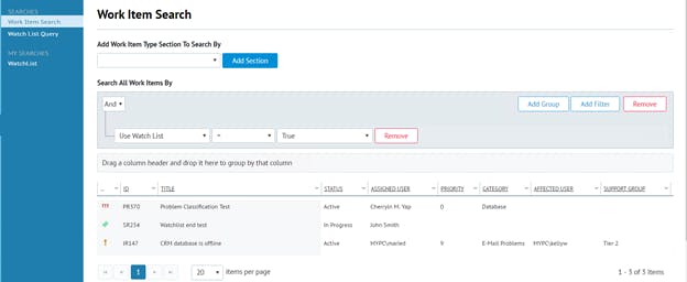 The WorkItem Search now contains a new Boolean property called Use Watch List. When this is set to true, the search they create will be filtered to the logged in user’s workitems in the Watch List.