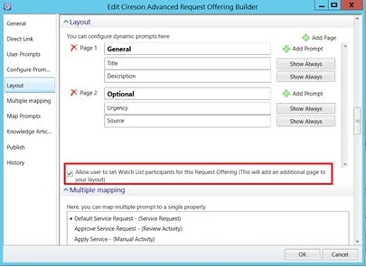 - On the Layout section, below the page layout and prompt configuration, there is a checkbox option to enable the Watch List on request offering. Once ticked, a new page containing the Watch List user picker option will be appended as the last page.