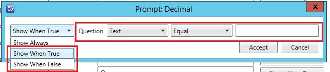 To set a show condition, Select either Show When True or Show When False, this will give you the option to create a condition based on a value/answer of another user prompt.