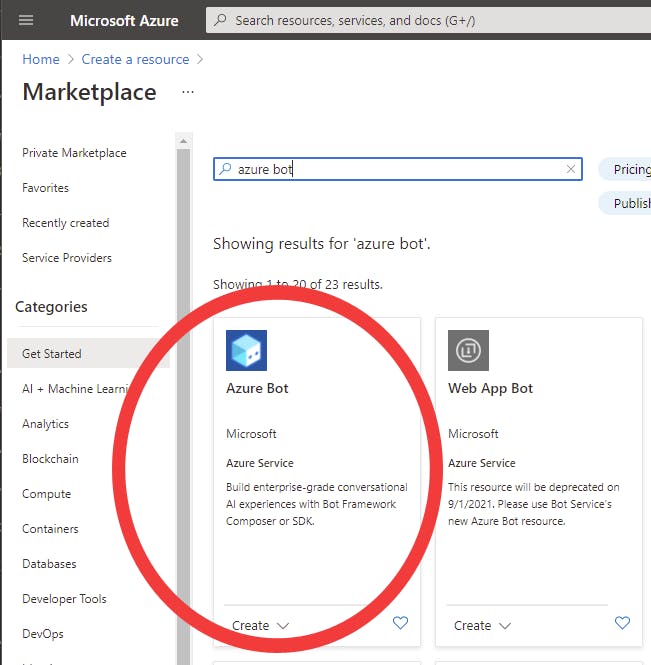 - Search for "Azure Bot" and then click it