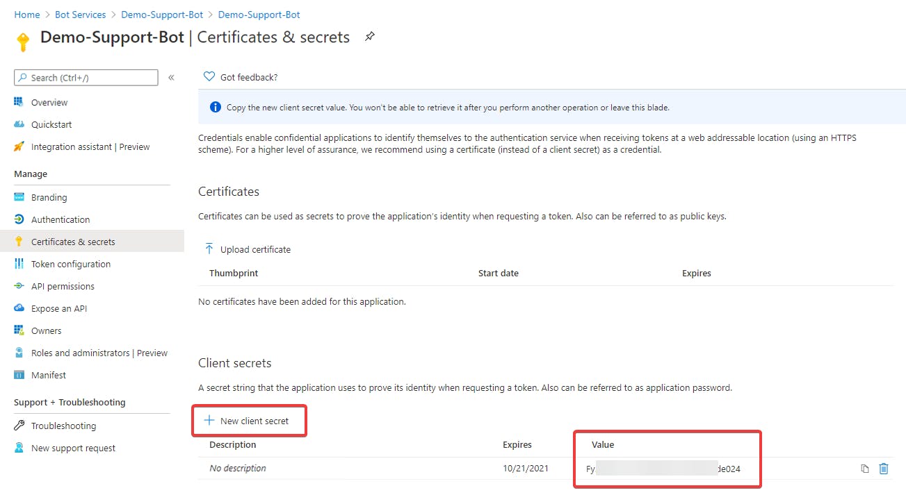 - Click on New Client Secret and go through the steps to create a secret key