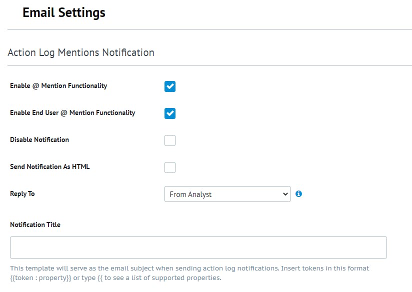 The Action Log Mentions Notifications allows for users (End Users or Analysts) to use the @ symbol when writing an Action Log comment to be able to ping another user and notify them of a comment.Â
