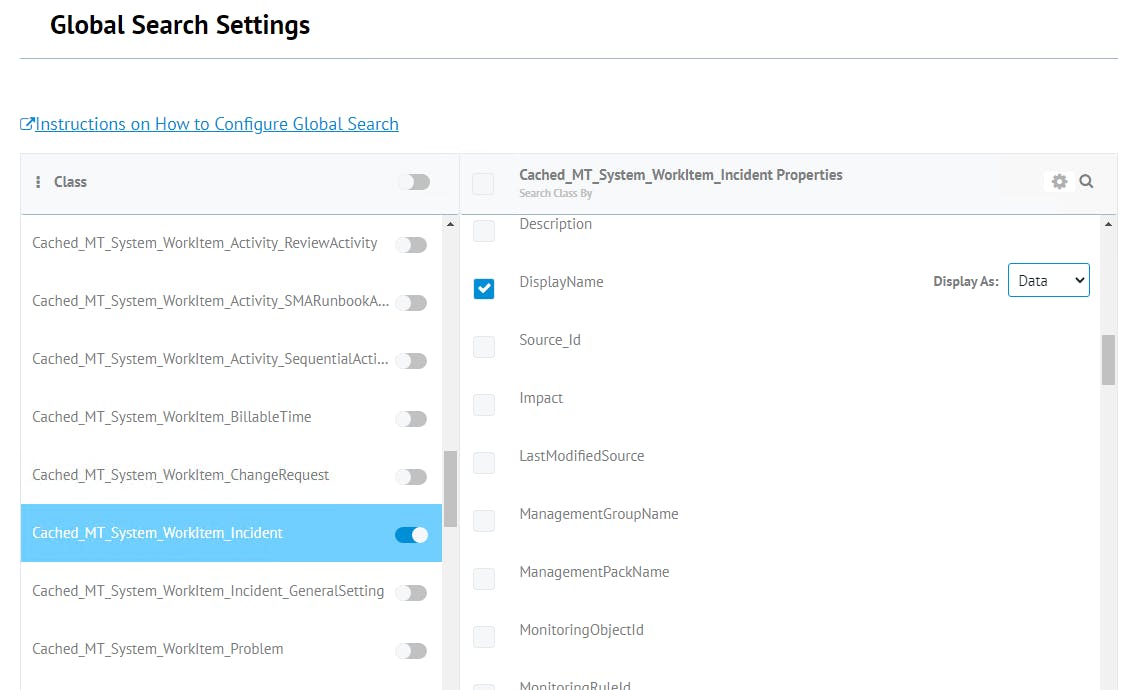 This page allows users to configure and manage what information is displayed when using the Global Search feature
