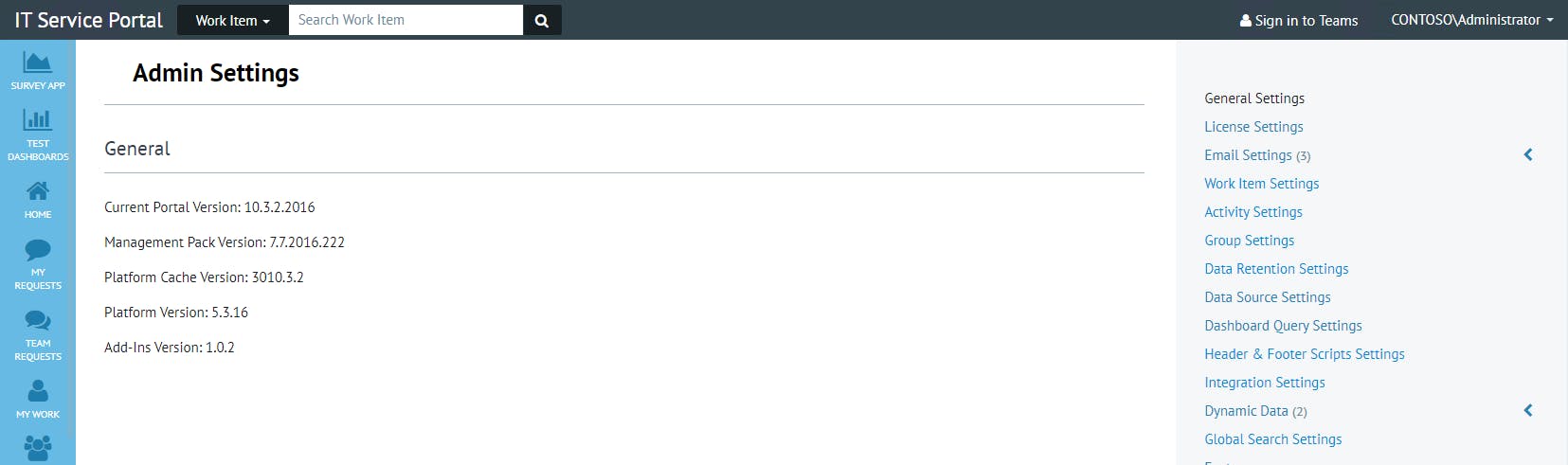 This is Admin Settings landing page which contains the portal version, the management pack version, Platform Cache details and the Add-Ins version.