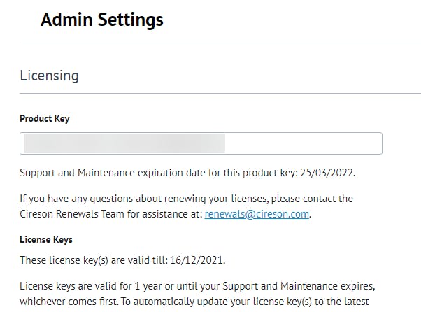 - Manually add license key. Deselect the "Automatically Refresh License Keys" check box and retrieve your license keys manually from Cireson’s licensing server and enter them in the appropriate license boxes.