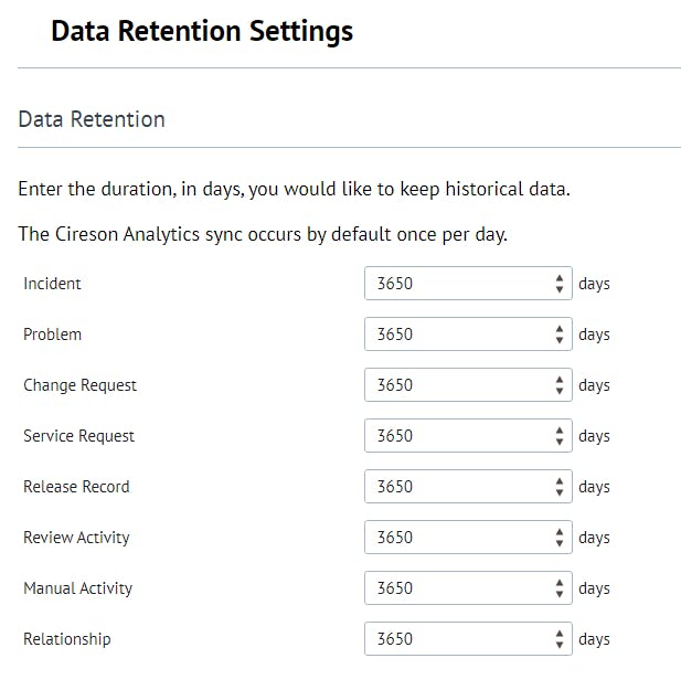 Details on Cireson Analytics Data Retention settings can be found here:Â KB1360 - How To: Cireson Analytics