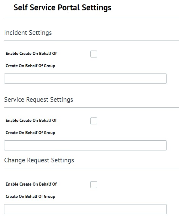 This page allows users to manage Create on Behalf of settings for Incidents, Service Requests and Change Request Request Offerings