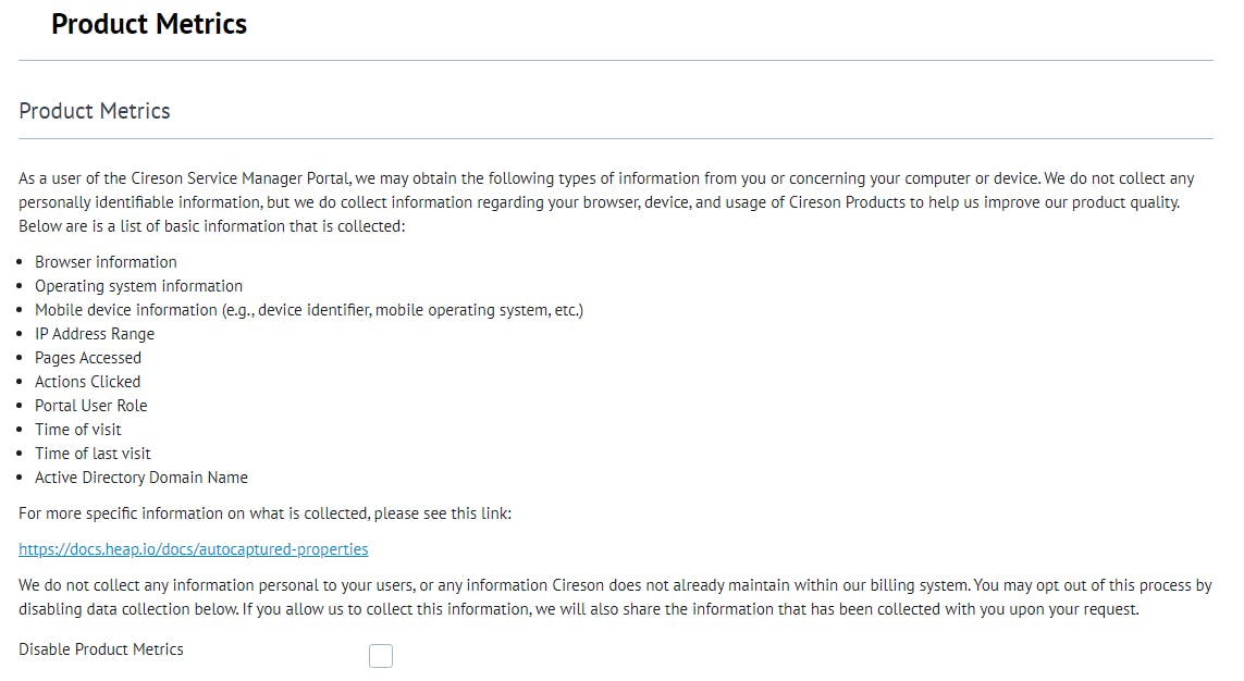 In this page you can opt in or out of allowing Cireson to gather non-identifiable data to help improve the Cireson Portal