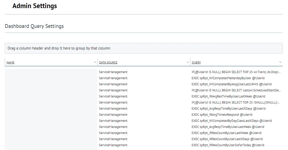 This page allows the user to add and manage custom dashboard query settings.