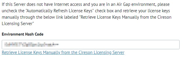 There are two ways of licensing a Cireson Product: Automatic and Manual. Automatic licensing is enabled by default and will 'phone home' to the Cireson Licensing Server to acquire a License Key to activate a product. Manual licensing is used if Automatic licensing cannot be used (such as if a server is 'Air-gapped' or if there are restrictions on the server that prevents access to blocked sites)