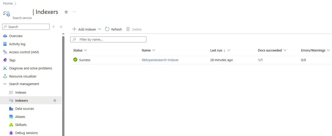 At this point, the Azure Search Service will re-index uploaded documentation for Open AI hourly. Additional documentation can be uploaded directly to the Azure Blob Storage account and the Azure Search Service's indexing schedules can be modified in the Azure Portal.