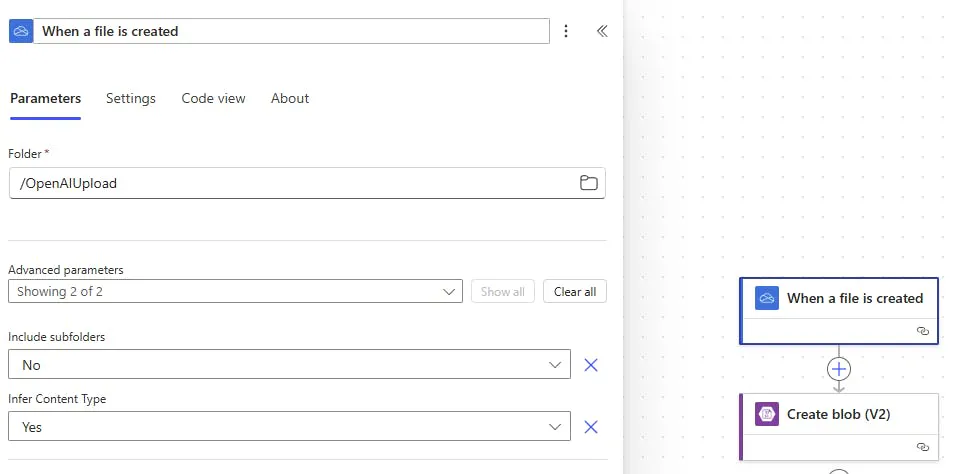 Take the following example wherein anytime a file is created/added to a folder called "OpenAIUpload"