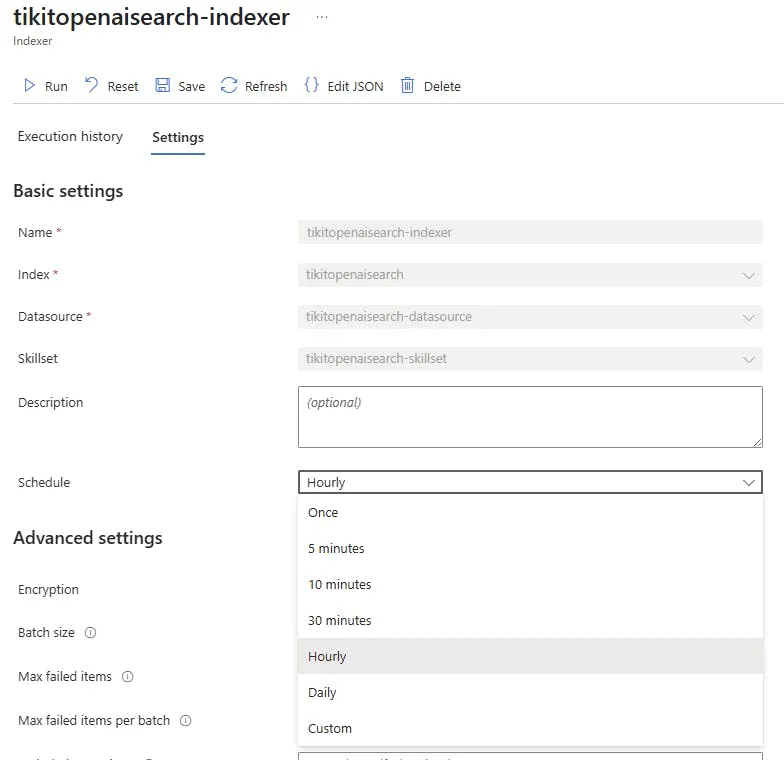 Here you can modify how often the schedule that runs training (indexing) against your Azure Blob Storage account.