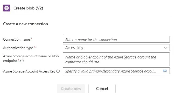 Regardless of the source of the file, you'll need to setup the Create Blob action that allows you to push the file into Blob Storage. To do this, add the "Create Blob (v2) Action into your flow and choose Access Key Authentication.