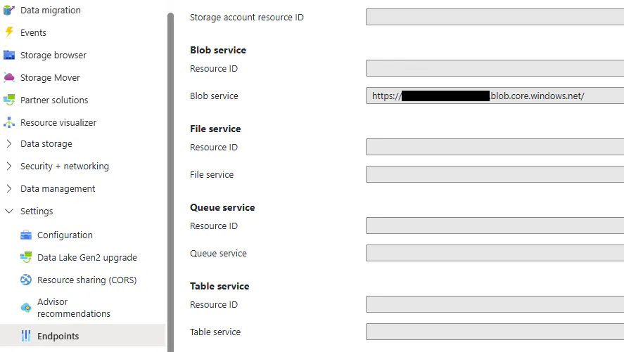 Azure Storage account name or blob endpoint: This URL can be obtained from the Azure Blob Storage resource by navigating to: