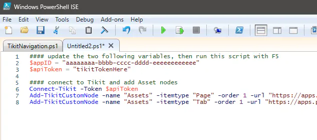 The associated PowerShell is a series of functions that support the ability to connect to your Tikit instance, Add, Get, Update, and Remove custom navigation. Once downloaded, unzip the file and open TikitNavigation.ps1 in either PowerShell ISE or VSCode and run it by pushing the F5 key.