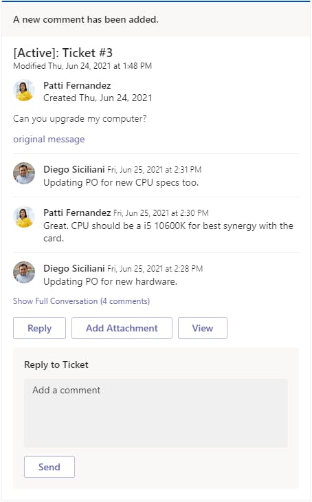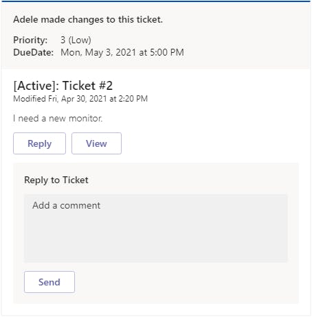 Select Send to save the comment. Tikit Virtual Agent will reply with the updated ticket and send a notification to the assigned analyst.