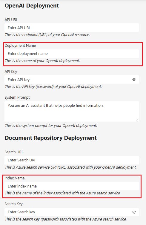 1. First, you’ll set your Deployment Name and Index Name. Unless these were set to something else they are: