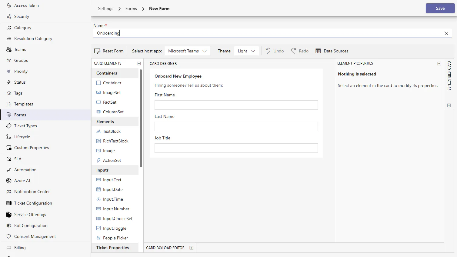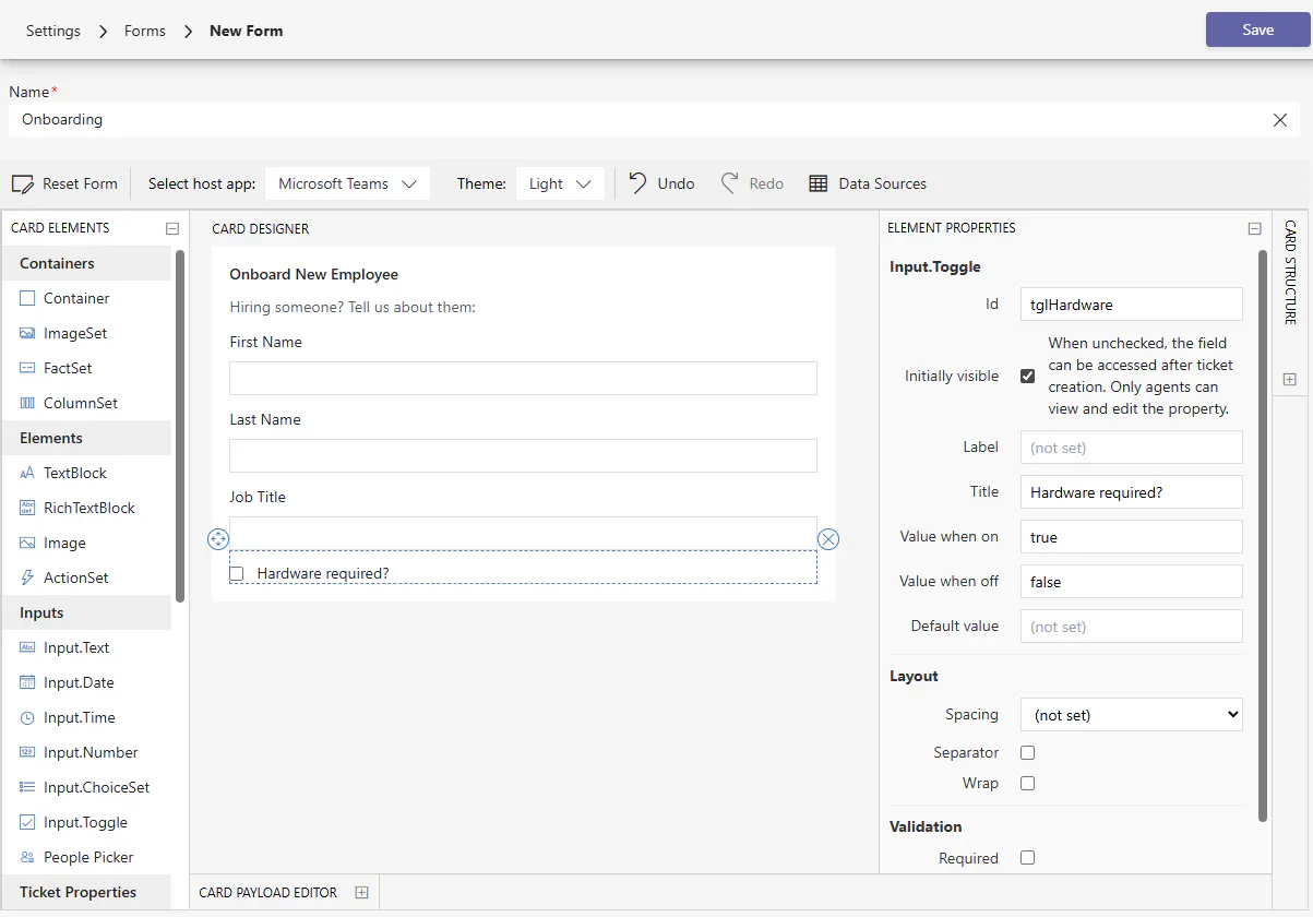 Card Payload Editor The card payload, or source code, that creates the form. Admins familiar with the Adaptive Card schema can update it directly here, but do so at your own risk!