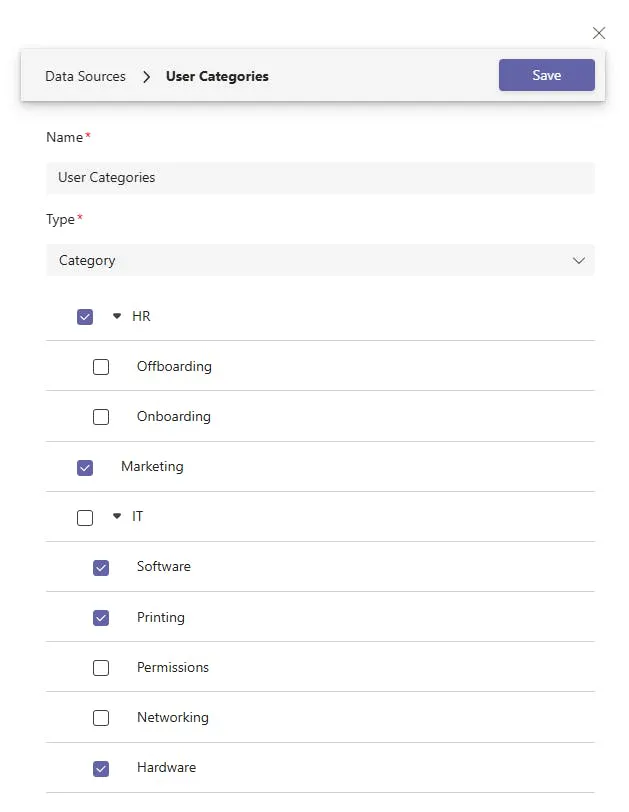 Data sources allow you to configure curated sets of data for various ticket properties. Think of data sources as a way to filter property options to only the ones you want your users to see when filling out a form. To configure a Data Source, click Data Sources at the top of the form designer, then select New Data Source. Give your new Data Source a name, then use the dropdown to select which data type you want to create. After selecting your data type, you will see a list of all of the data points for that property. Check the checkboxes next to the items you wish to be displayed to the user when choosing that data type. When the user is presented with the form, the dropdown for that data type will only display the items you checked. After creating the Data Source, click on the form element matching that data type and select the newly created Data Source in the dropdown.