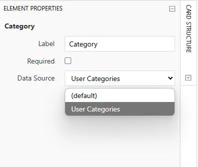 The Card Structure pane provides a detailed view of the form’s elements. An element can be selected from both the Card Area and in the Card Structure pane. Select an element to view and update its properties.