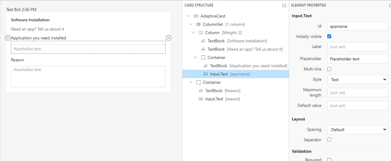 To add an element, click and drag the element to the Card Area pane. To learn more about Adaptive Cards, see Authoring Cards