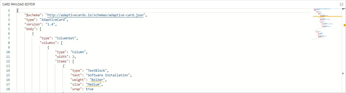The Card Payload Editor lets admins familiar with the Adaptive Card schema directly view and edit the source payload for a card. For more information on the Adaptive Card schema, see Schema Explorer.
