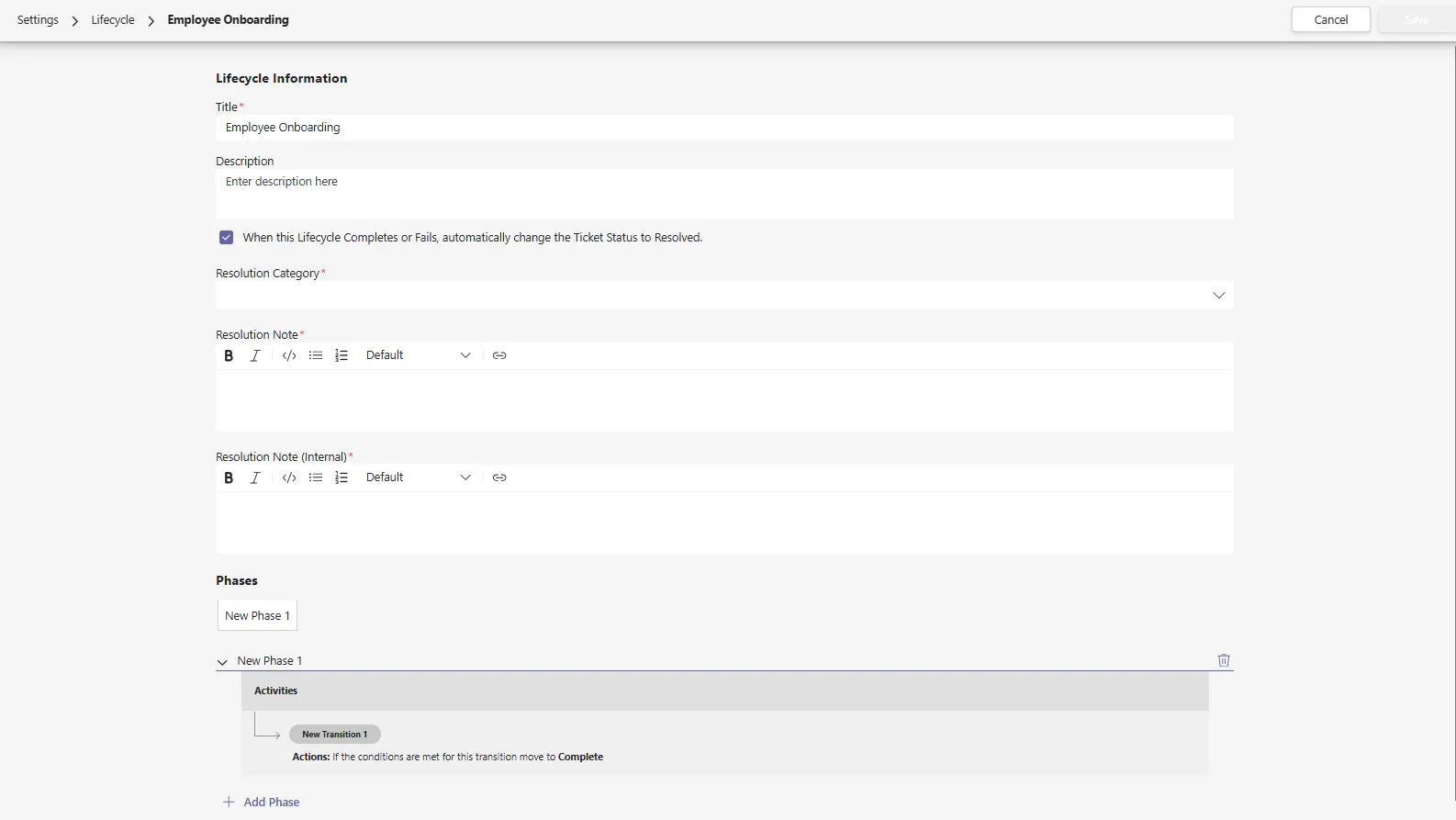 The Lifecycle creation wizard appears and you will see some values that you can enter for your new Lifecycle. A title for the Lifecycle is required and will help you identify it later should you need to make changes. If you chose to enter a description in the Description field, it will be displayed along with the title in the main Lifecycle settings view. Beneath the Description field is a checkbox that allows you to set whether to automatically change the ticket status to Resolved when the Lifecycle completes successfully, or fails due to a Task being marked as âFailedâ or an Approval being marked as âRejectedâ.