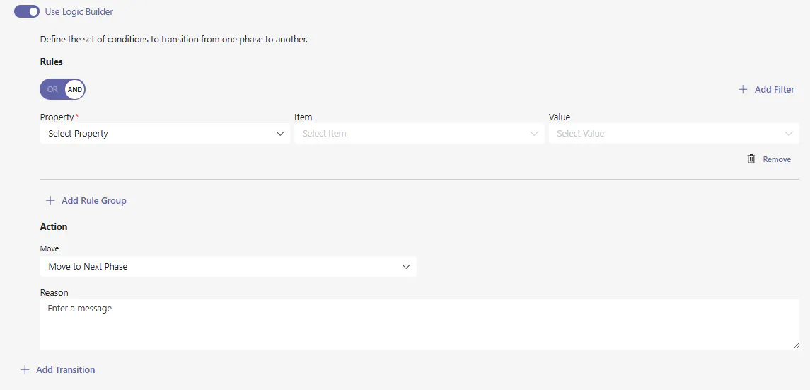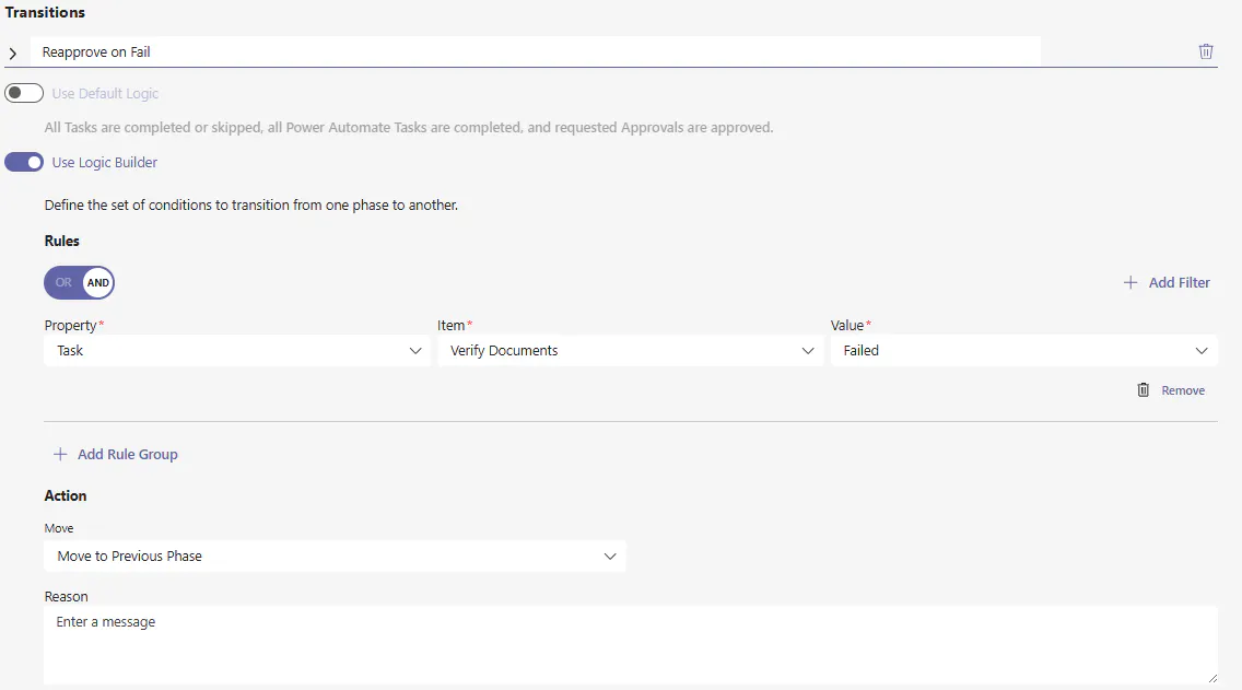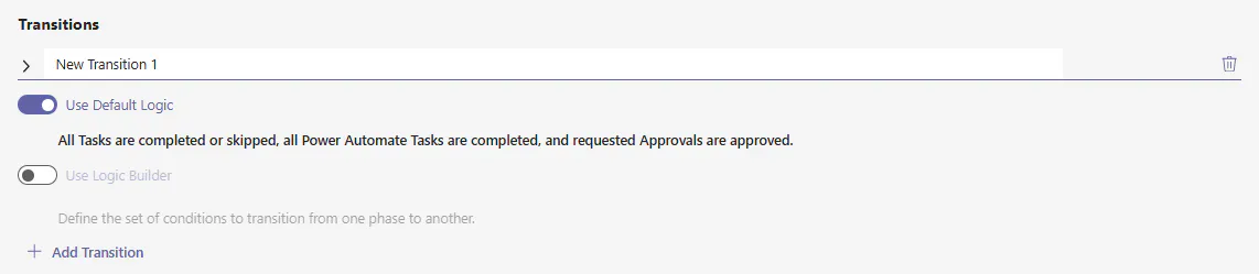 Here you have the opportunity to rename the Transition and change the behavior of the Transition from âUse Default Logicâ to âUse Logic Builderâ. The first option âUse Default Logicâ, requires that all tasks and approvals in a Phase are completed before the Lifecycle moves to the next linear Phase in the Lifecycle. The second option, âUse Logic Builderâ allows you to take manual control of your Transition and customize the behavior. This allows you to specify the behavior that happens when specific criteria are met by your Tasks and Approvals. For example, you can create a Transition that moves you back to a previous Phase in the Lifecycle if an Approval is rejected.