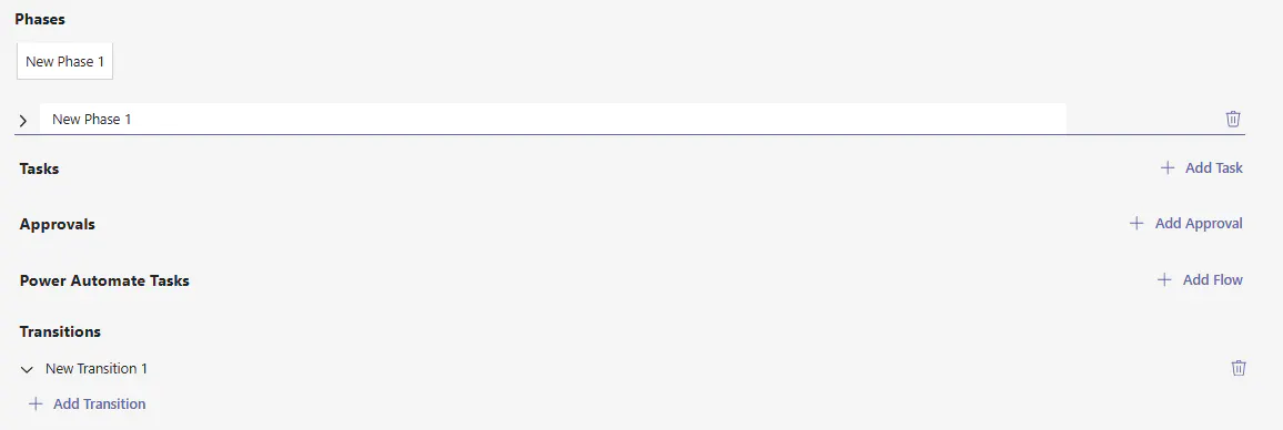 Next, you will see the Phases area for the Lifecycle along with a new Phase titled âNew Phase 1â along with a summary of the contents of the Phase which right now just contains a single Transition. Click on the arrow next to the name of the Phase to expand itâs contents. Here you have the opportunity to rename the Phase to a name of your choosing, add Tasks or Approvals, and create Transitions.