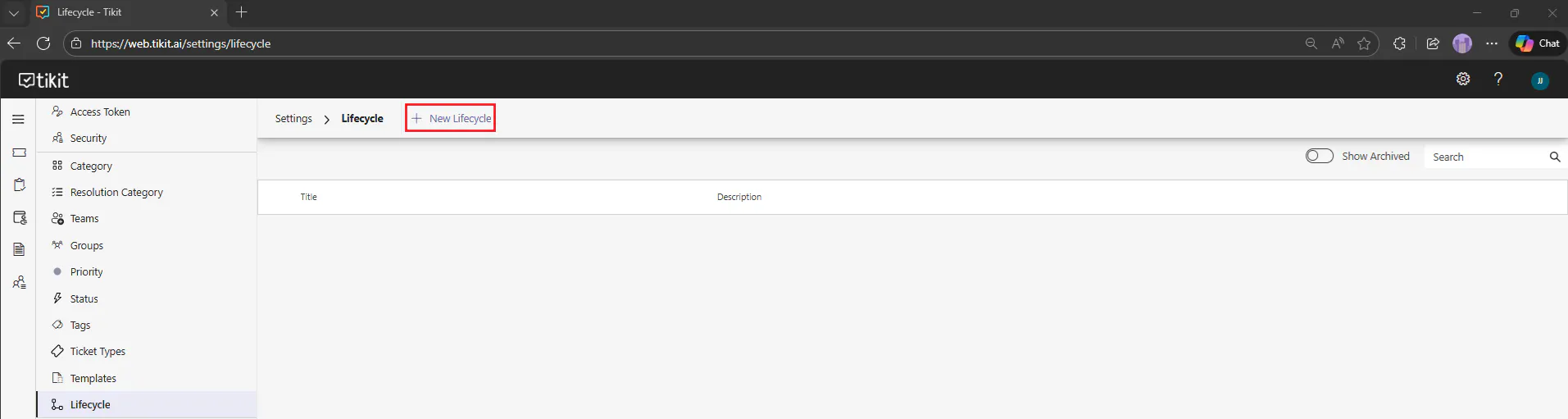 To create a Lifecycle, log in to the Tikit Web UI as an Administrator and go to Settings > Lifecycle and click âNew Lifecycleâ.