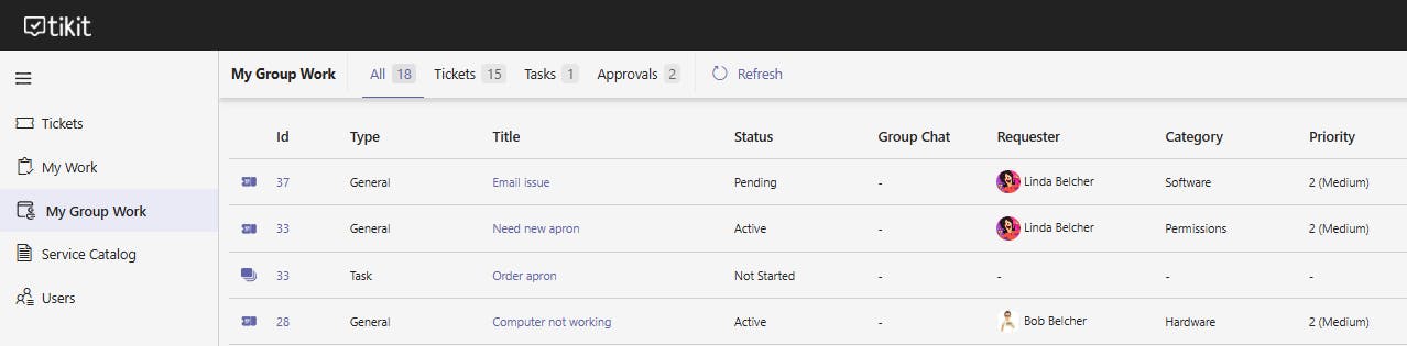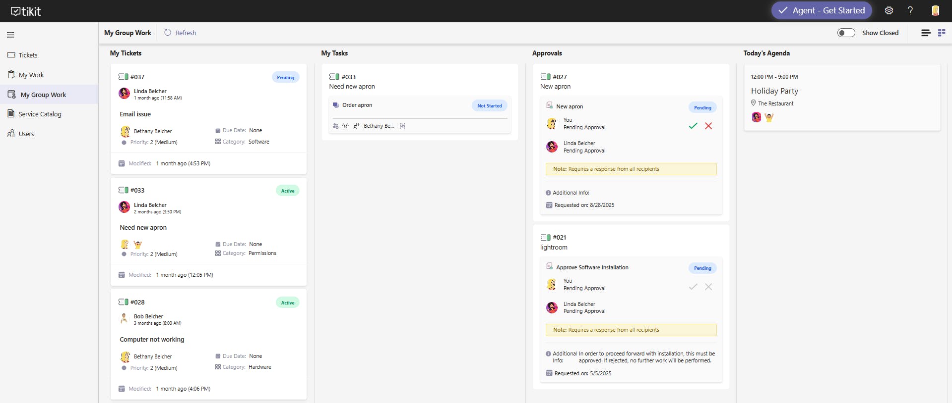The My Group Work List View provides an Agent a list of all their currently assigned work. The view tabs along the top of the view allows for filtering work by Tickets, Tasks, Approvals, and All work.