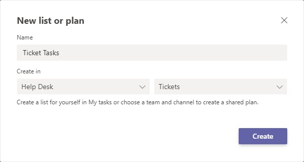 Enter in a plan name, then select the Team and Channel to create a shared plan.