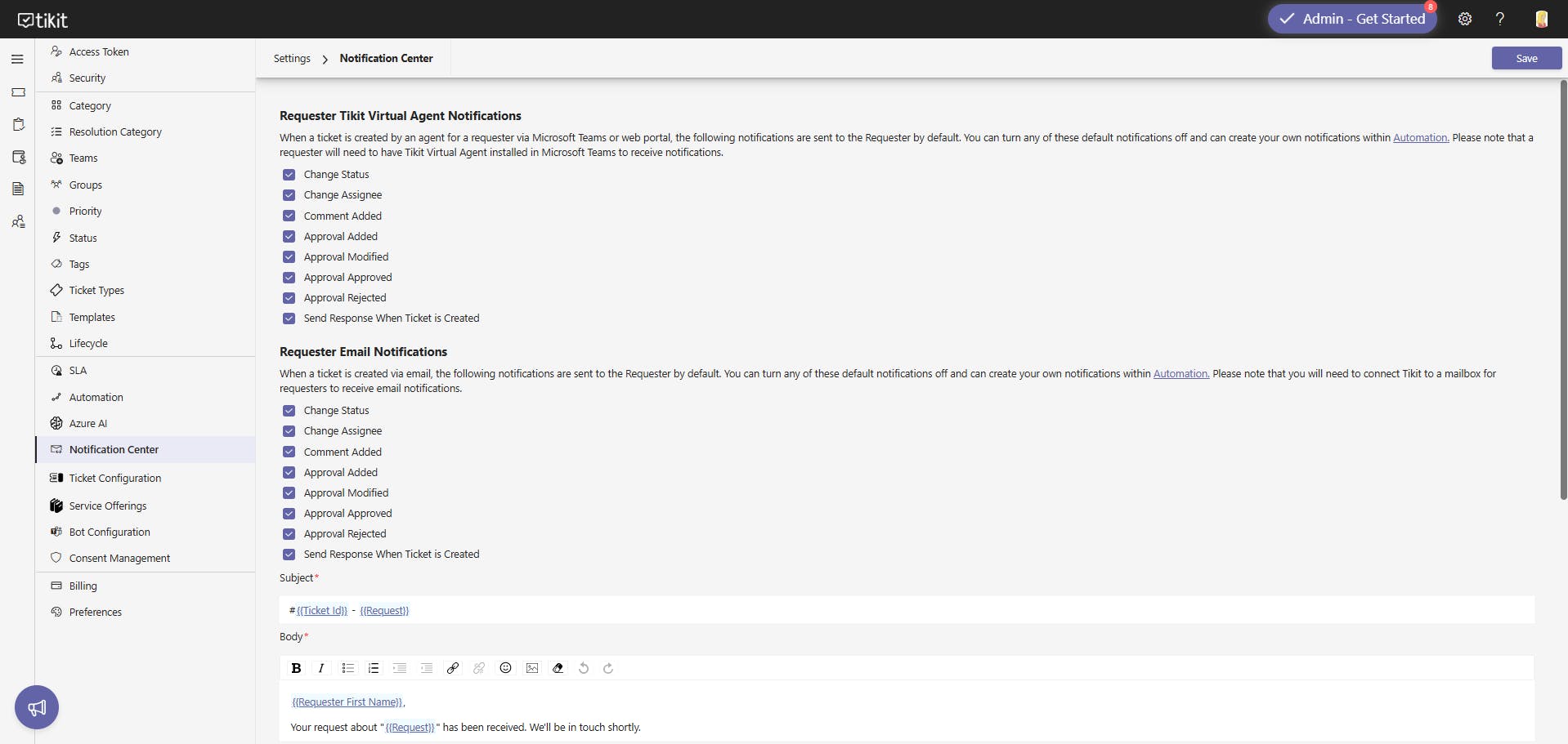 To view and update the Notification Center settings in the Tikit web app: