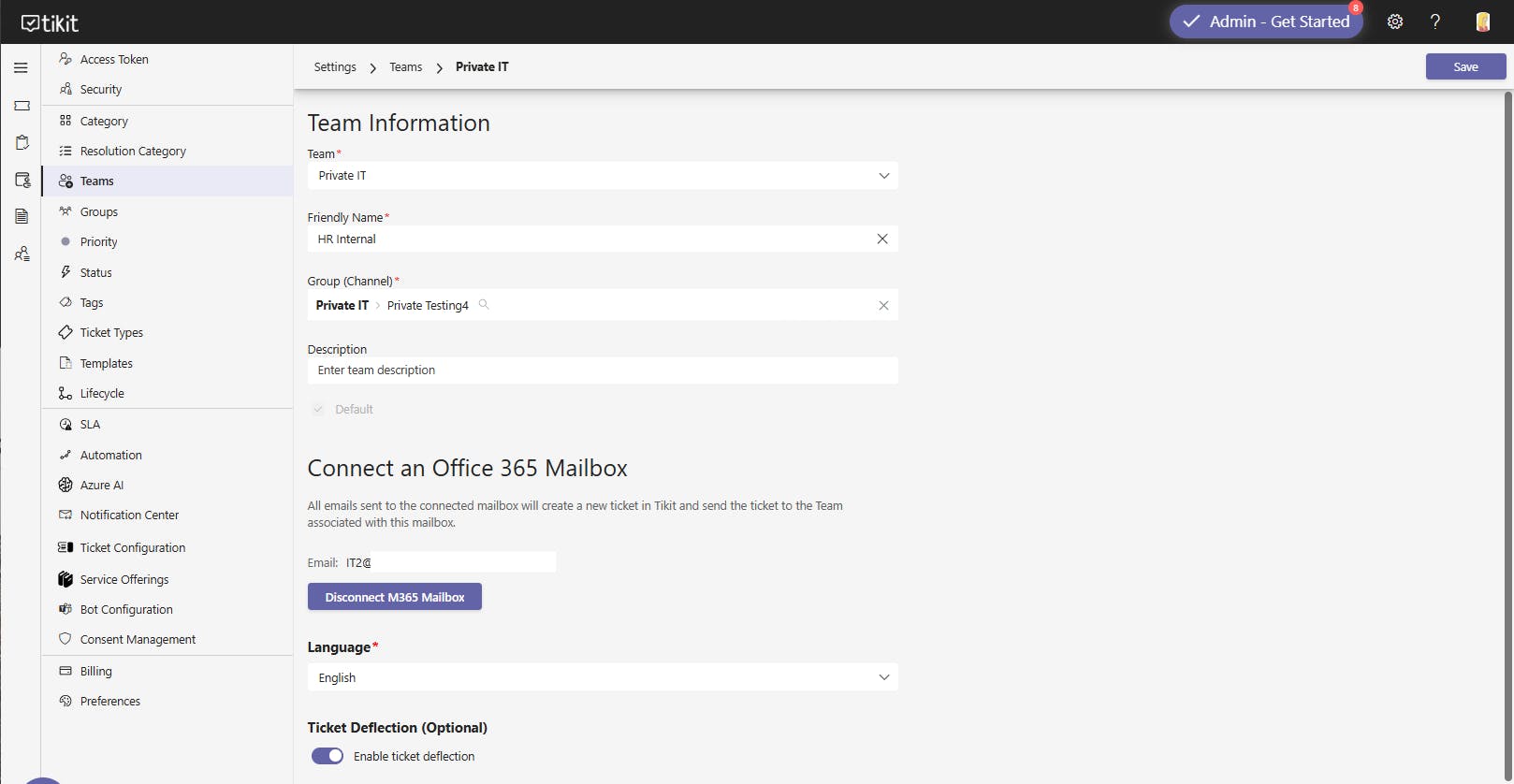 Connect each Team to a mailbox within the Teams section of Tikit. All emails sent to the connected mailbox will automatically open new tickets in Tikit. Note that connecting a shared mailbox is supported to avoid having to use an additional M365 license.