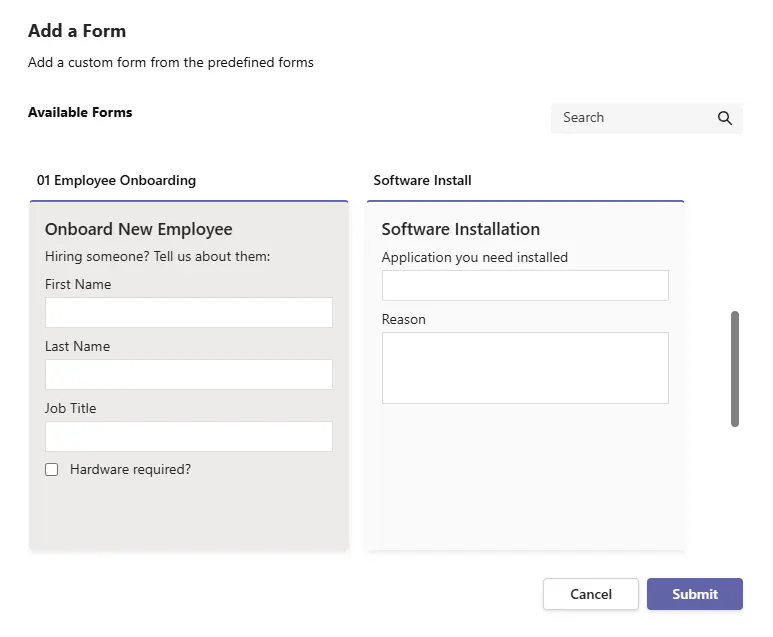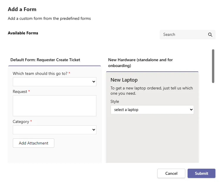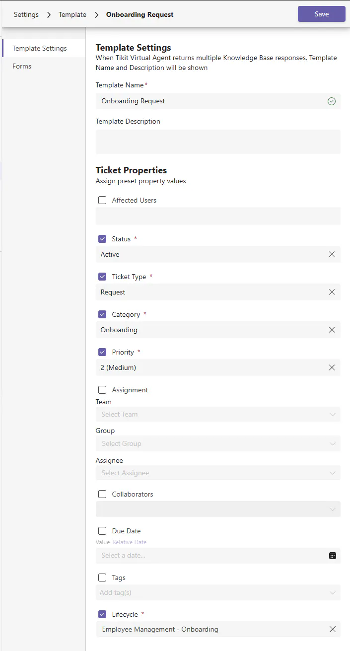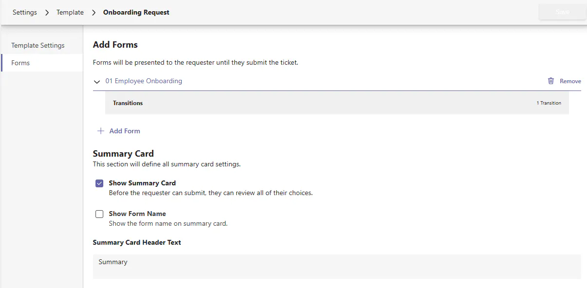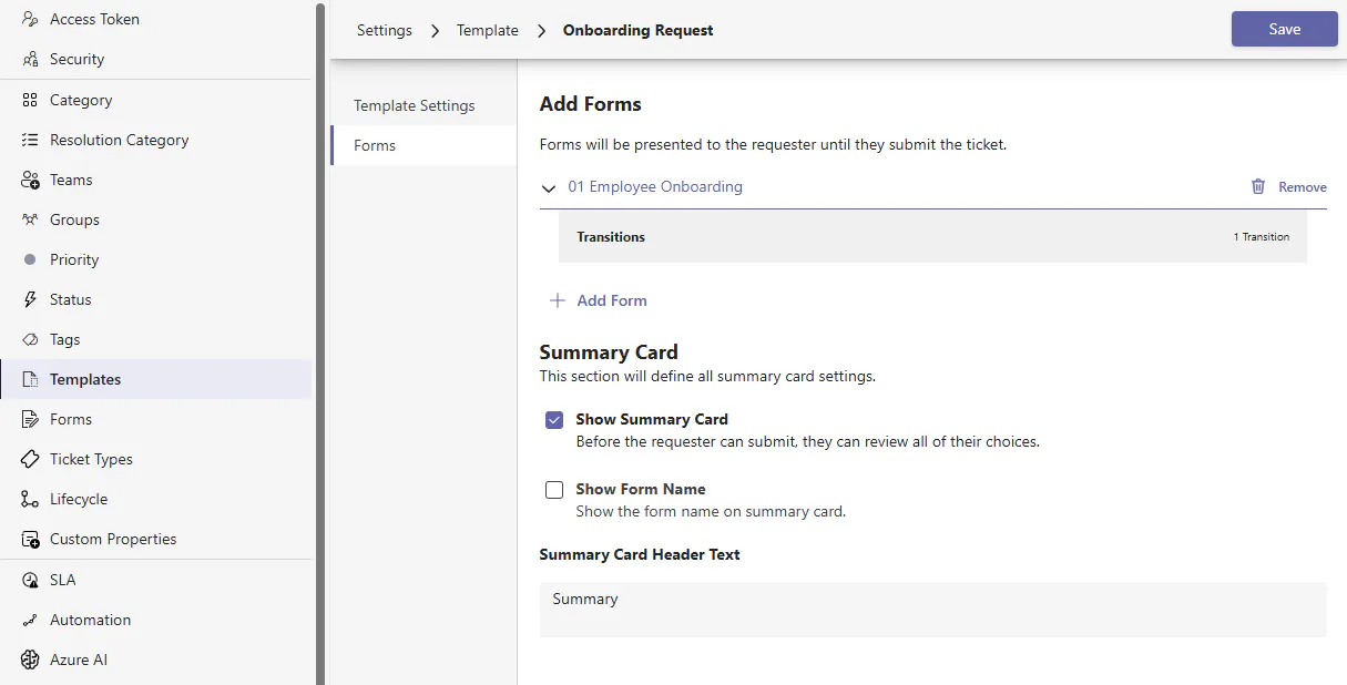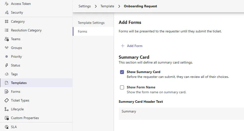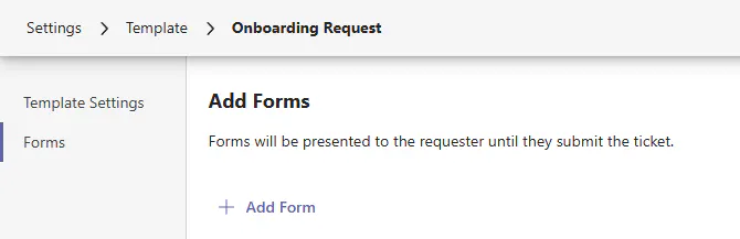 Templates can also optionally have one or many Forms associated to them to serve in requirements gathering for a ticket. With forms, you can also optionally control the experience of when the next form is served to the user filling a ticket out whether it be in Teams, Request Portal, or Agent Portal.